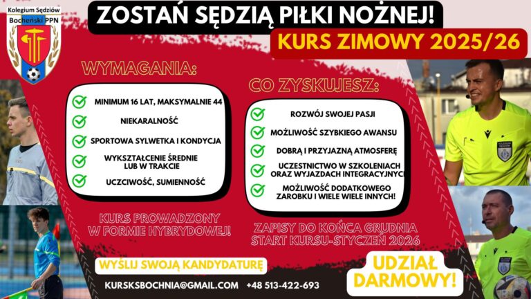 Kolegium Sędziów w Bochni ogłasza nabór na Zimowy Kurs Sędziowski 2025 To doskonała okazja dla wszystkich pasjonatów piłki nożnej, którzy chcą spróbować swoich sił w roli sędziego i stać się częścią futbolowych wydarzeń od środka – z gwizdkiem w ręku. Zapisy na kurs trwają do końca grudnia 2025 roku, natomiast jego…